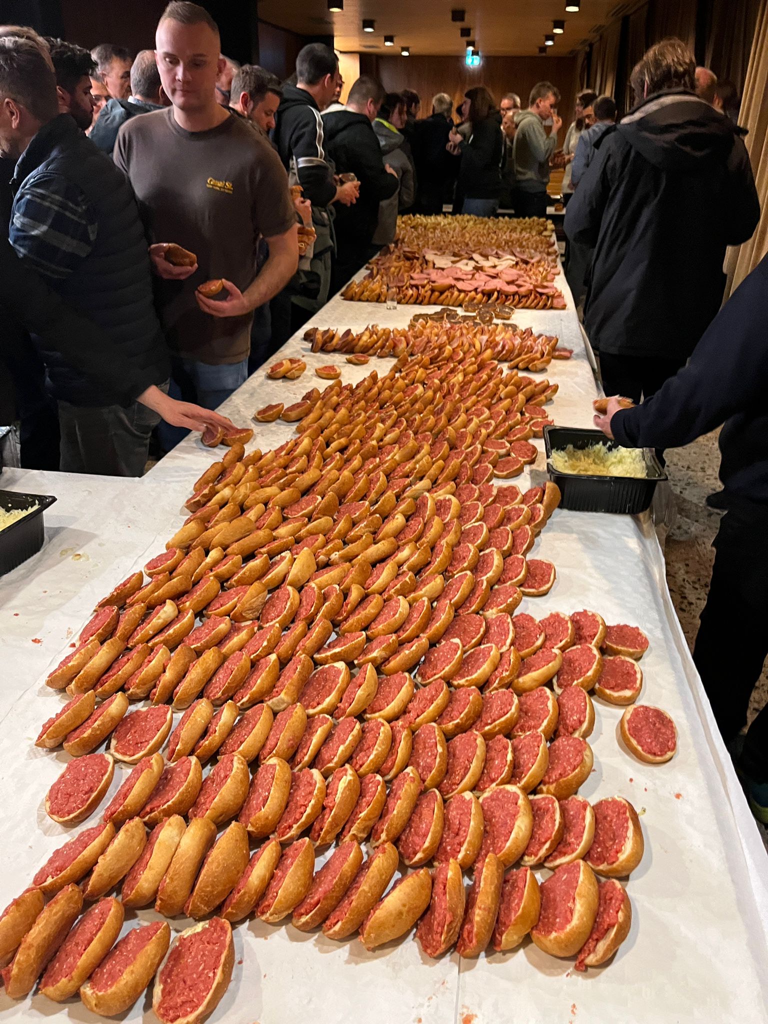 Der Name Brötchenturnier wird durch die Speisung der Meute nach der 8ten von 14 Runden gerechtfertigt. Den Ausgehungerten angemessen wird viel rohes Mett mit Zwiebeln feil geboten, aber auch andere Wurst- und Käsesorten waren vertreten. Menschen mit Schnupfen hatten den kleinen Vorteil, dass ihnen der eigentümliche Geruch des Spielsaals wohl verwehrt blieb. Vorteilhaft erwies sich auch das Mitführen von reichlich Tempos, um auf dem Spielfeld bzw. dem Tisch nicht festzukleben.